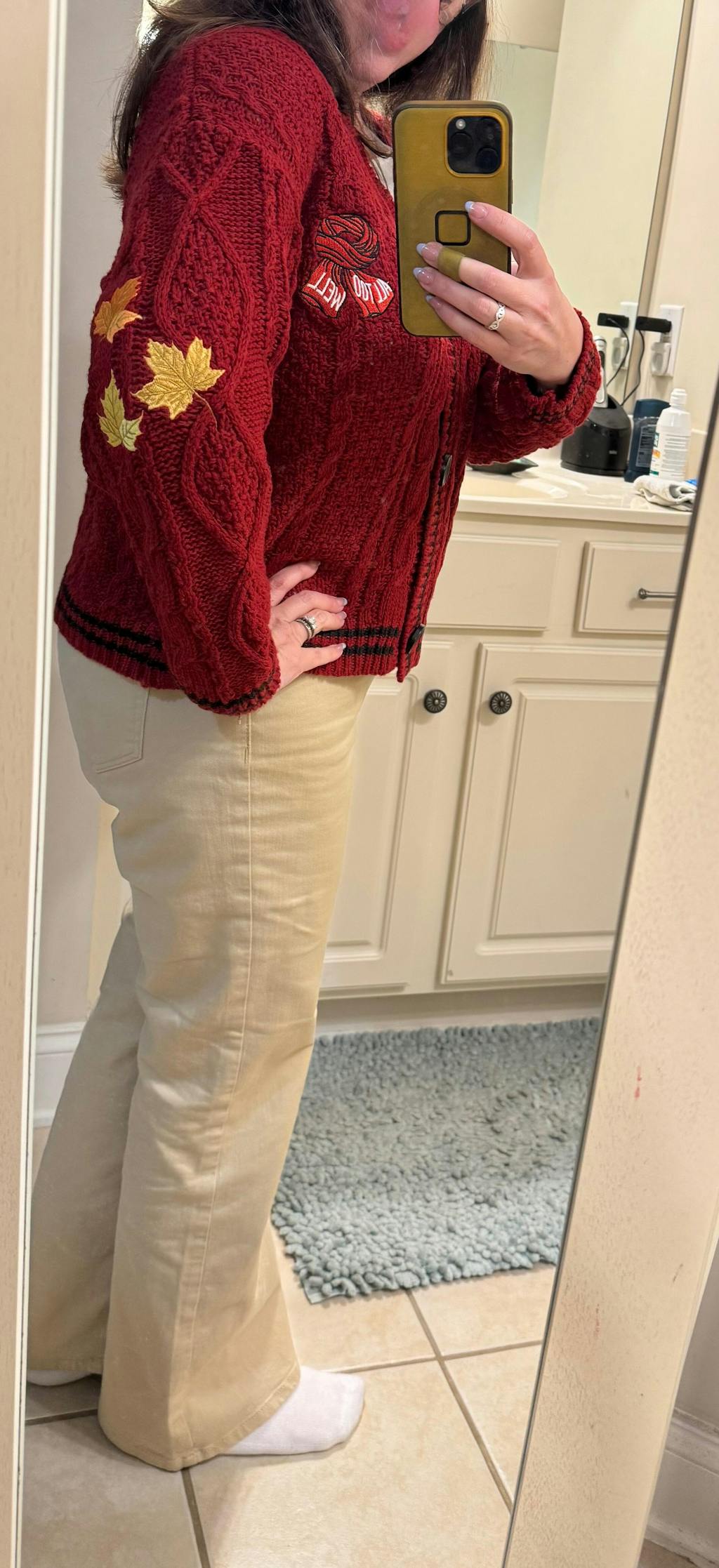 I love the bright red color and the leaves on the leaves are nice. The embroidered scarf is cute too. But the material of the sweater itself is just not as soft as I’d expected, and I overall just don’t love it for the price. For how much this cost, I expected the quality to feel better. The sizing is fine. I’m 5’2” / 145 lbs and typically wear an 8 and ordered a medium. It fits fine.