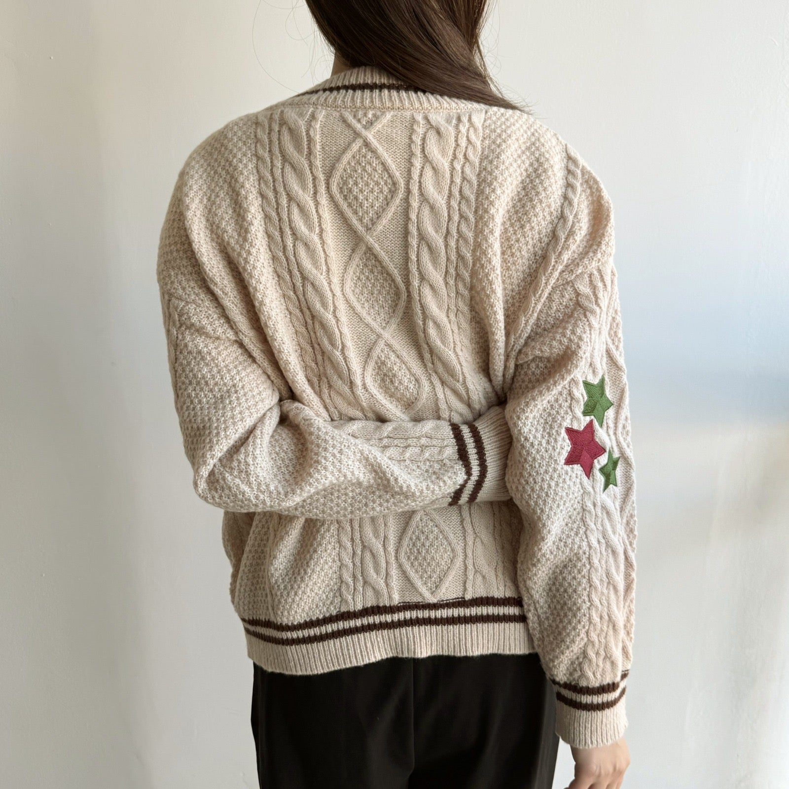 After washing, reshape the cardigan while damp and lay it flat to dry. Do not tumble dry, bleach, or iron directly on the fabric.