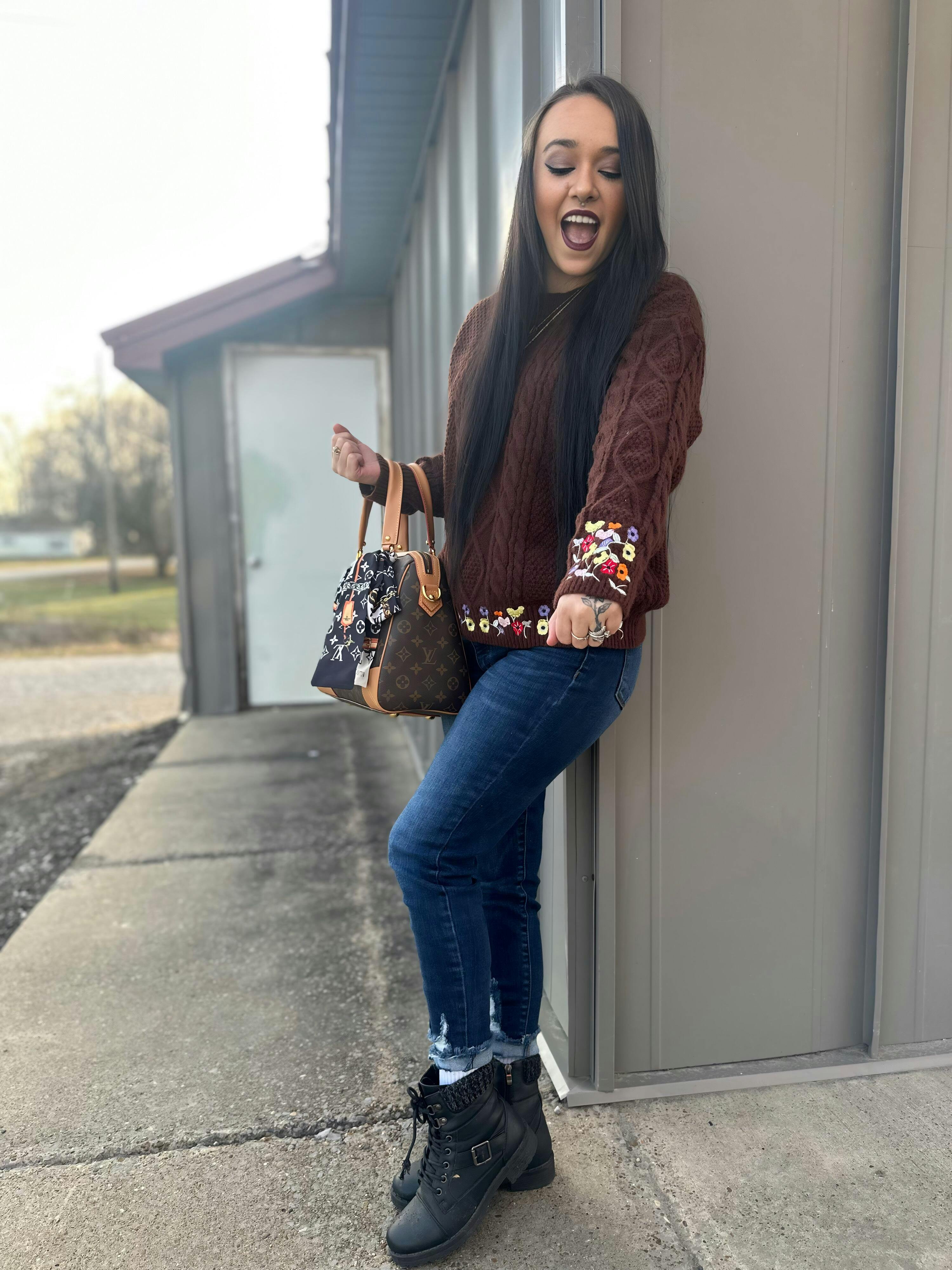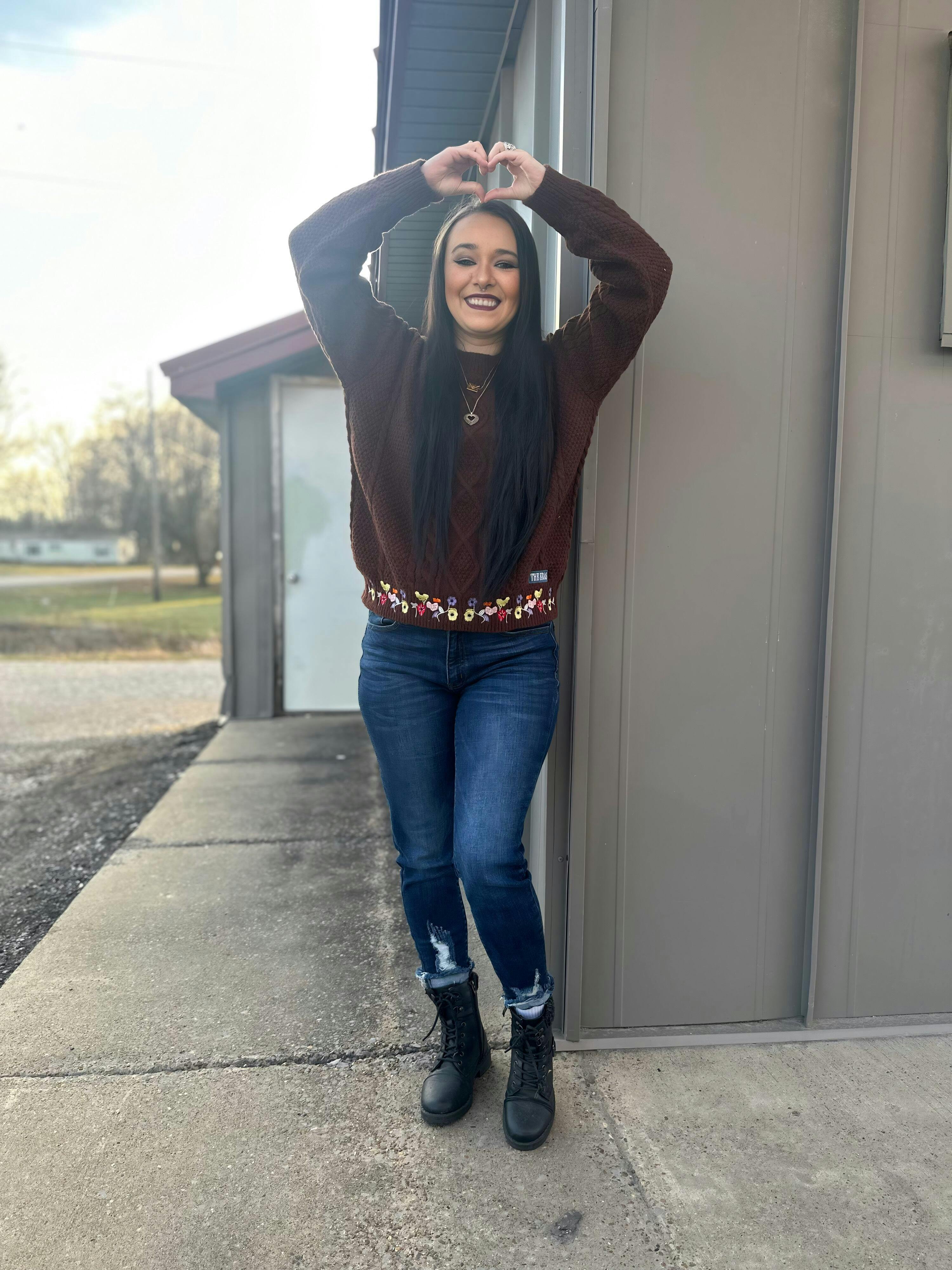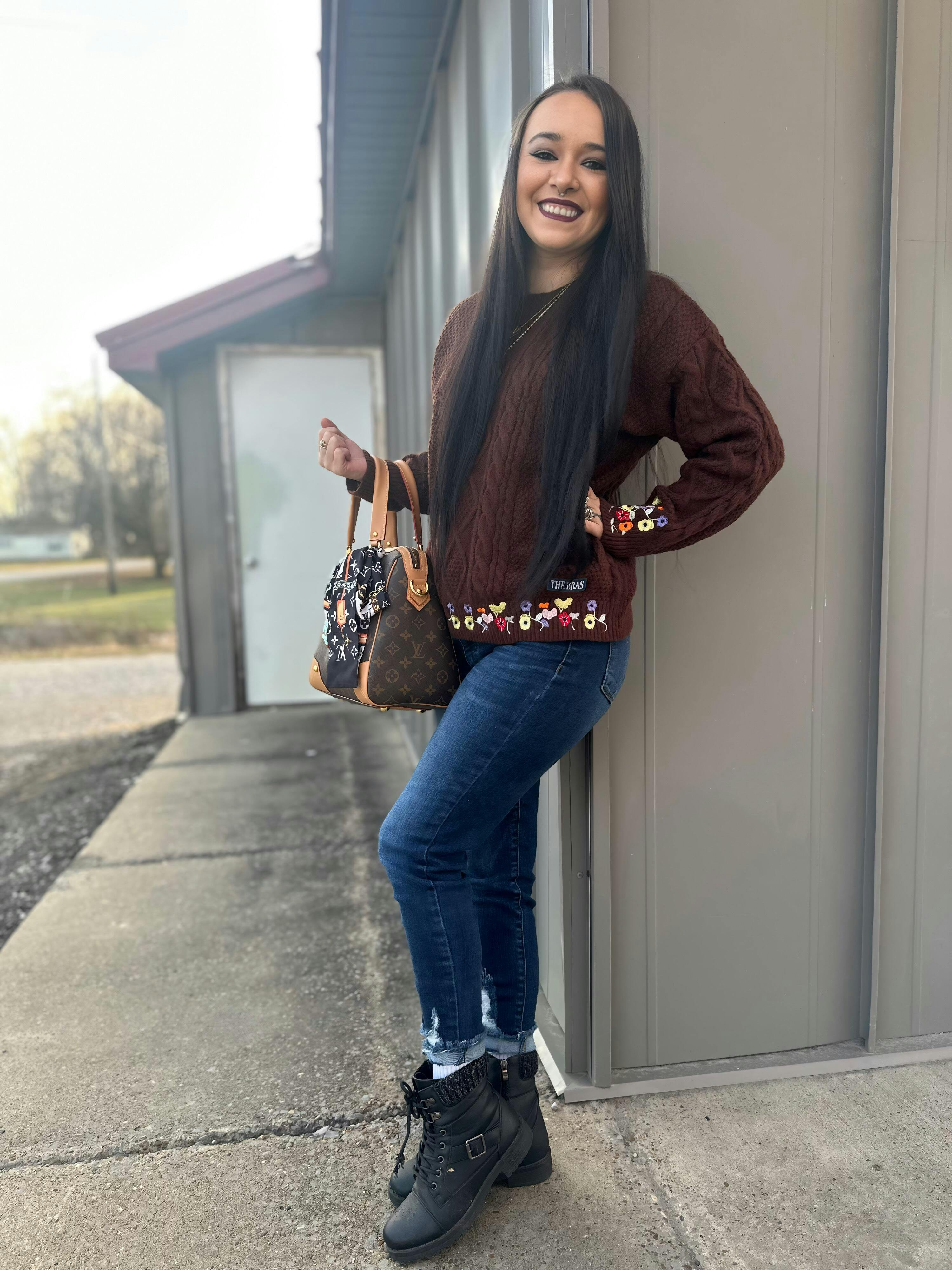 Introducing the Eras Flower Sweater – a cozy, richly textured knit inspired by a moment of pure joy. Crafted in a deep chocolate hue, this cable-knit sweater features delicately embroidered florals in shades of violet, poppy red, daffodil yellow, and soft ivory – a nod to the iconic flower-covered piano that accompanied countless unforgettable songs.