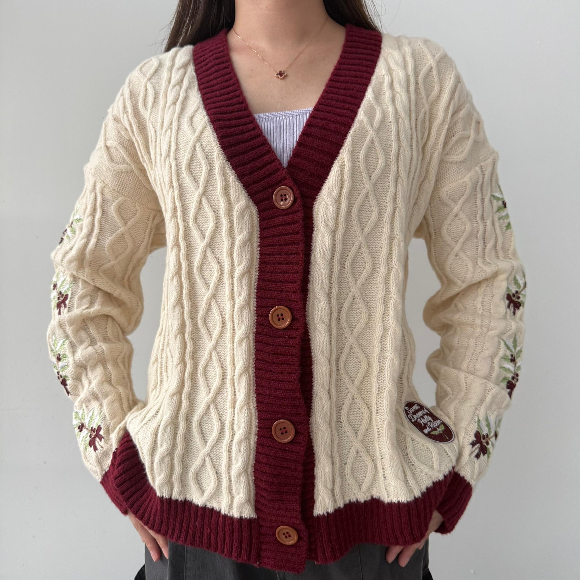 With its classic cream cable knit, deep burgundy trim, and delicately embroidered holly and ribbon motifs, it feels like a soft hug from a snow-covered season.
