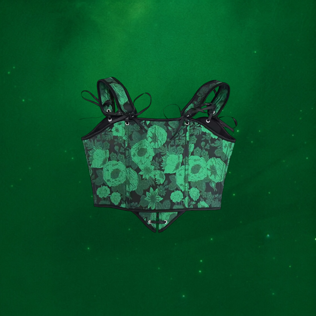 A striking green floral corset with lace-up detailing — perfect for layering or standing out on its own. Add a little drama to your wardrobe.