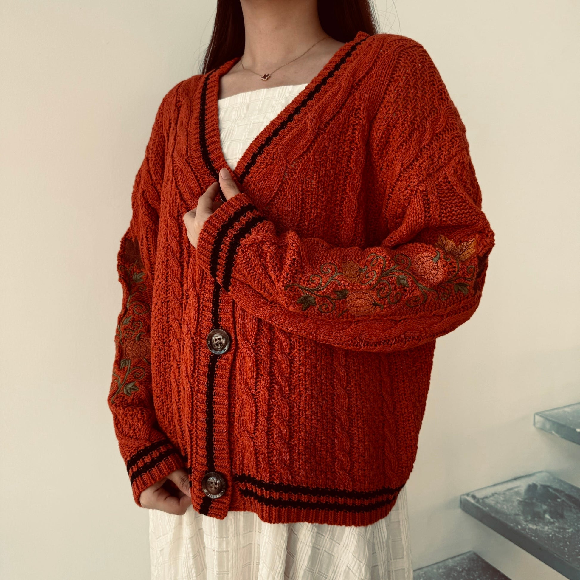 A burnt orange cable knit cardigan with intricate pumpkin vine embroidery along the sleeves. The perfect autumn layering piece, designed to bring a touch of harvest charm into your wardrobe.