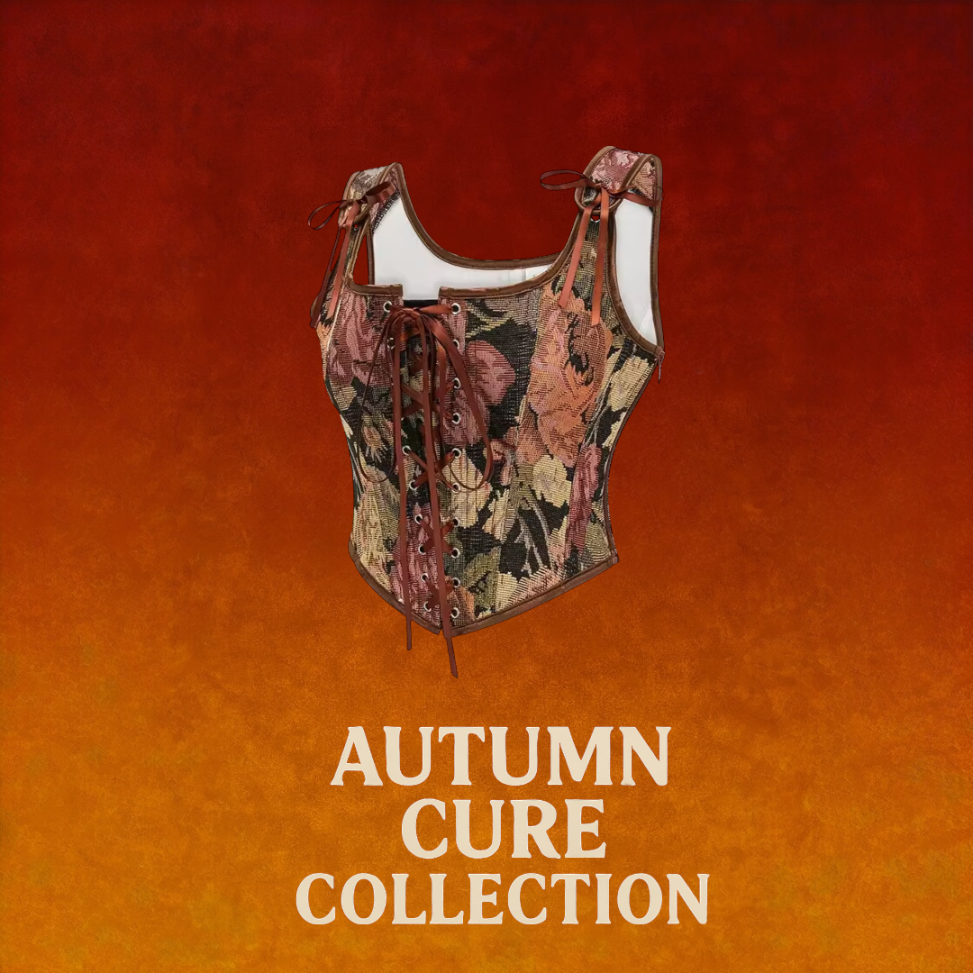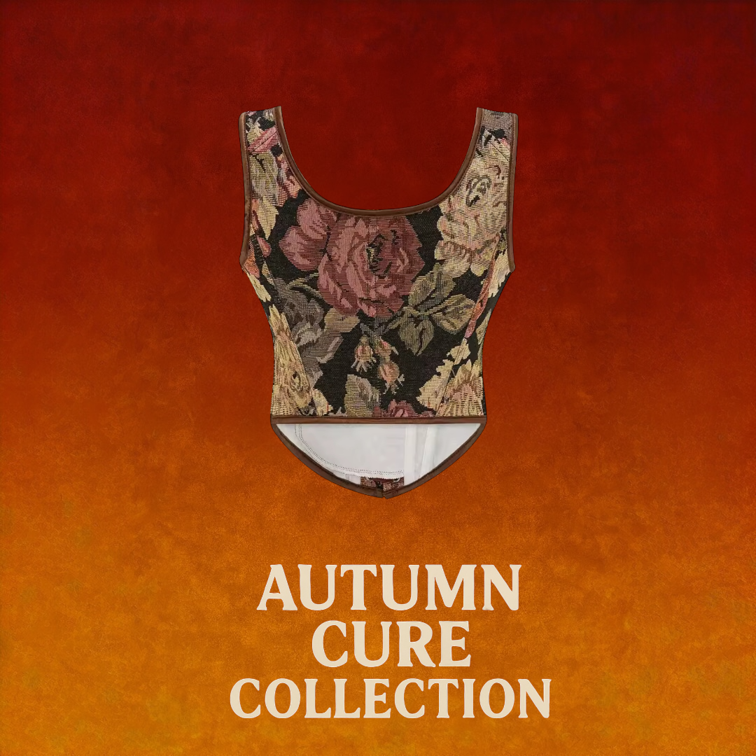 A tapestry-style corset featuring deep florals in earthy browns, greens, and rose tones. With lace-up details and ribbon ties, this piece feels like stepping into an enchanted forest. Wear it layered over dresses or paired with jeans for a bold statement.